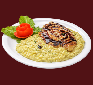Fresco risoto de arroz arbóreo com abobrinha. Acompanha tilápia grelhada + molho oriental