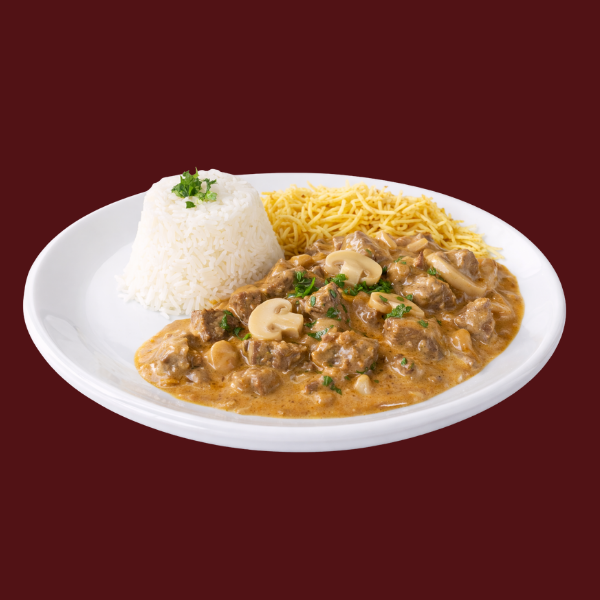Delicioso Strogonoff feito c/ patinho e champignon paris (não dá pra tirar). Atenção: no lugar da farofa vai a batata palha.