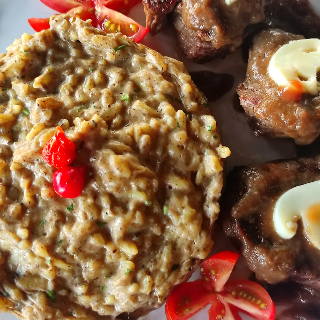 Delicioso risoto feito com tradicional arroz arbóreo, Molho funghi c/ champignon. Acompanha filé mignon ao ponto.